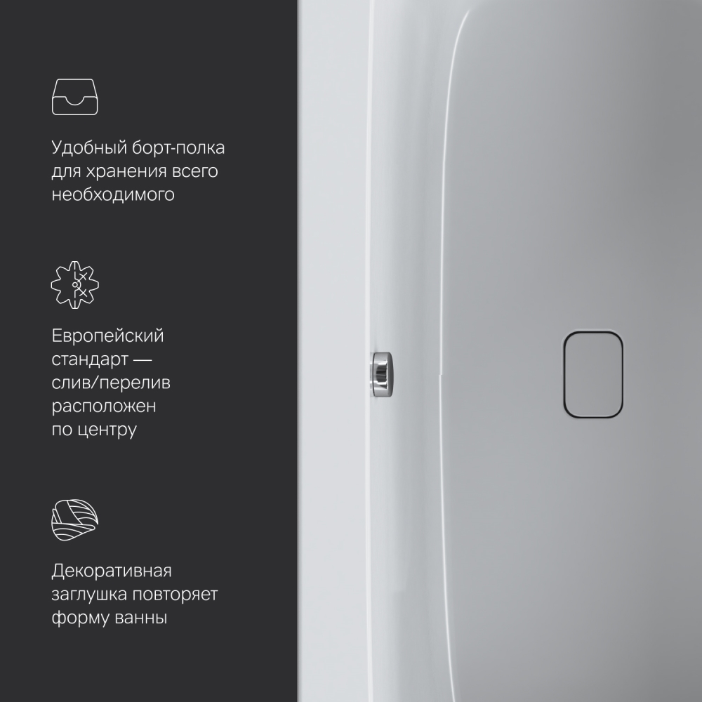 Характерный дизайн: сочетание широкого борта с одной стороны с ультра-тонким бортом с другой стороны создает неповторимую квинтэссенцию стиля. А декоративная заглушка слива повторяющая форму самой ванны станет яркой деталью в интерьере.