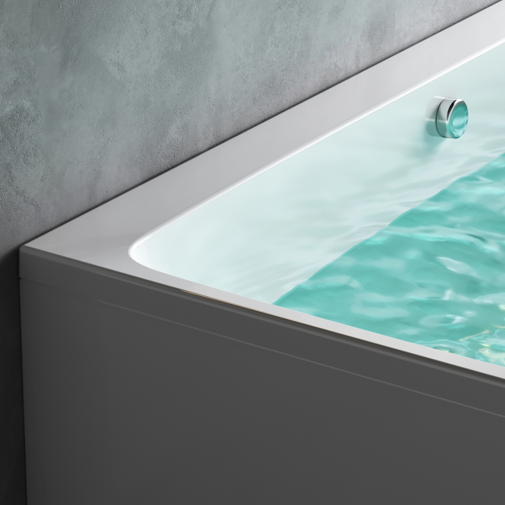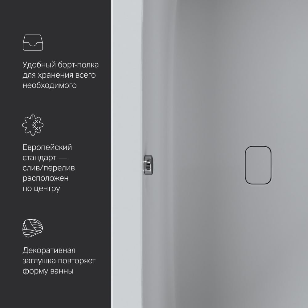 Характерный дизайн: сочетание широкого борта с одной стороны с ультра-тонким бортом с другой стороны создает неповторимую квинтэссенцию стиля. А декоративная заглушка слива повторяющая форму самой ванны станет яркой деталью в интерьере.