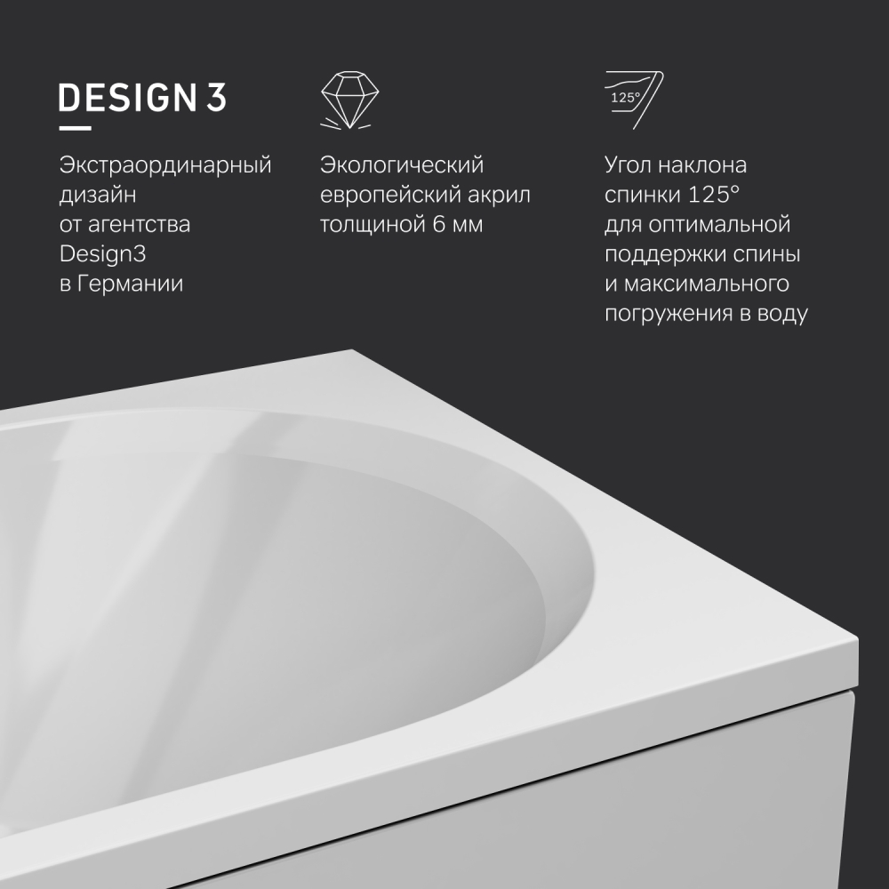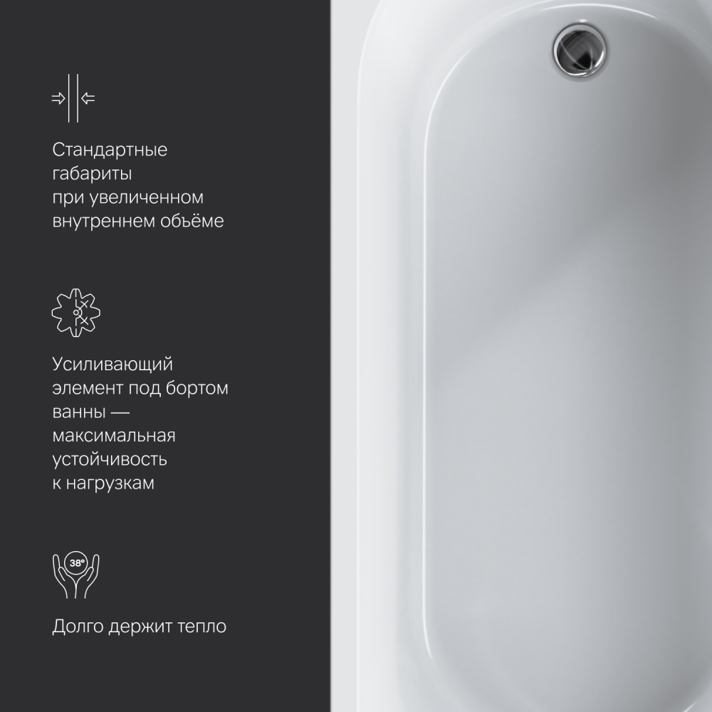 Увеличенный внутренний объем при стандартных внешних габаритах благодаря ультратонким бортам делает процесс принятия ванны комфортным для человека любой комплекции. А универсальный дизайн подойдет как для современного так и для классического интерьера.