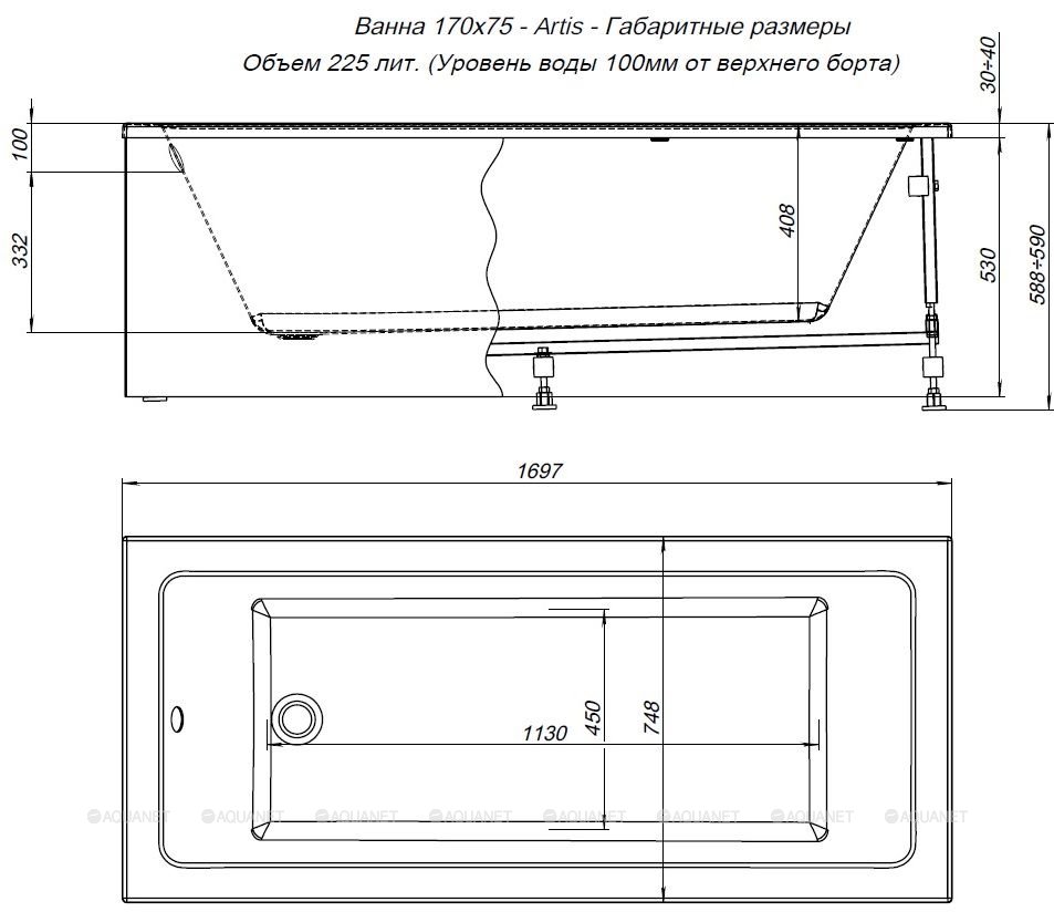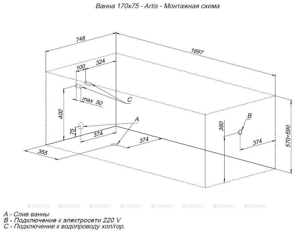 Ванна акриловая Aquanet Artis 170x75x64 белая (362844)
