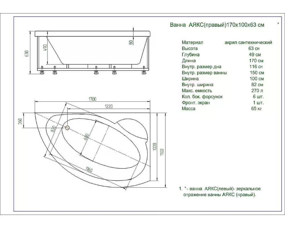 Ванна акриловая Aquatek Аякс-2 170x110 правосторонняя белая (AYK170-0000089)