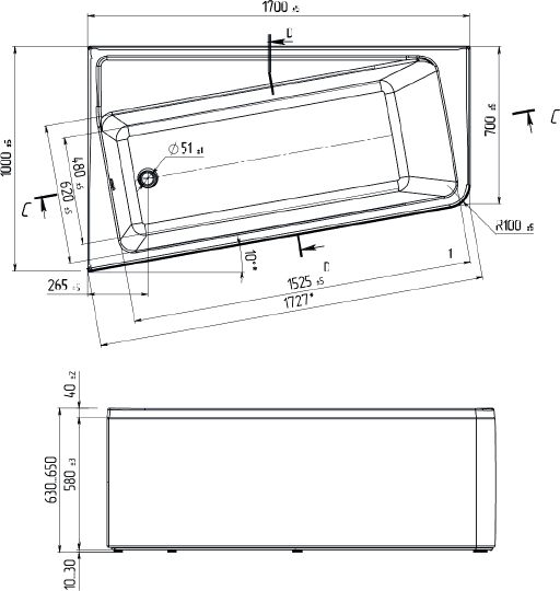 Внутреннее пространство выполнено в виде прямоугольника, расположенного под углом. Для правильного и удобного расположения в ванне спинка слегка наклонена.