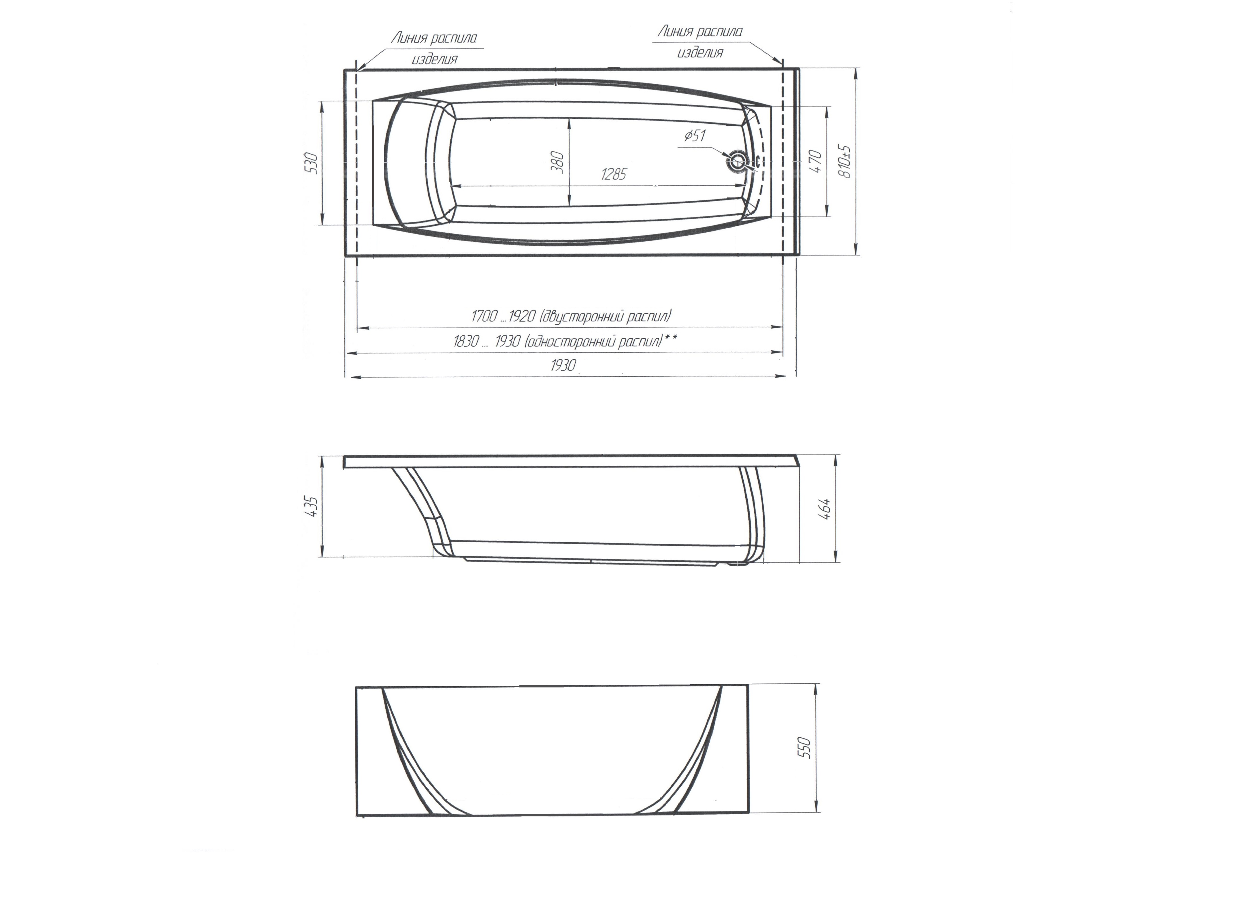 Дополнительная информация: возможность отрезки ванны до 170 см, но не более 11,5 см с каждой стороны.