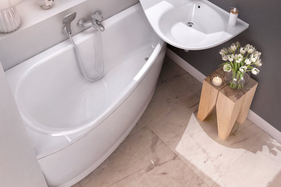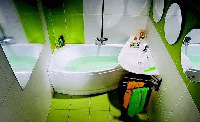 Акриловая асимметричная ванна решит пространство маленькой ванной комнаты.
