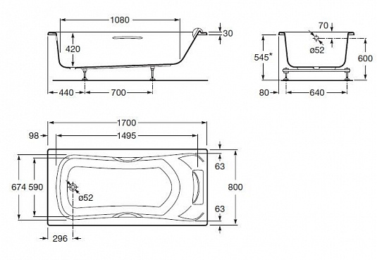 Устанавливается ванна на каркас с регулируемыми по высоте опорами и имеет пристенный способ расположения в месте подвода сливных коммуникаций. Монтажный комплект (ручки хромированные, каркас, комплект креплений к стене, к фронтальной панели, система слив-перелив) докупается отдельно. Дополнительно можно приобрести фронтальную и боковую панель, подголовник.