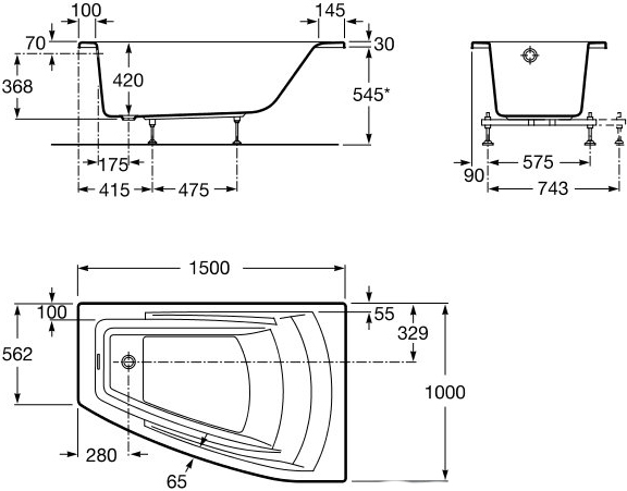 Ассиметричная акриловая ванна Roca Hall Angular с плавными линиями украсит любую ванную комнату.