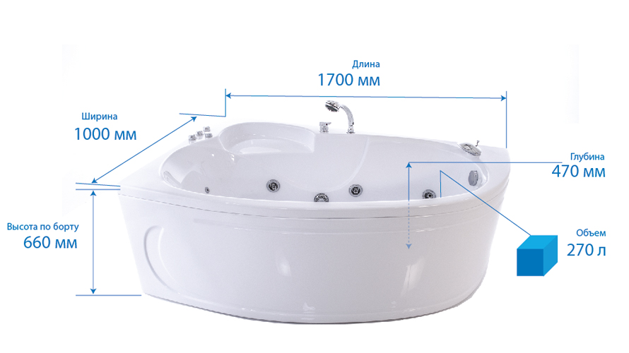 Также есть возможность дополнительных комплектаций гидро- и аэромассажа и дополнительных опций - подсветки и хромотерапии, смеситель на борт ванны, подголовник. Эти возможности (дополнительное оборудование) заказываются опционально за дополнительную стоимость.