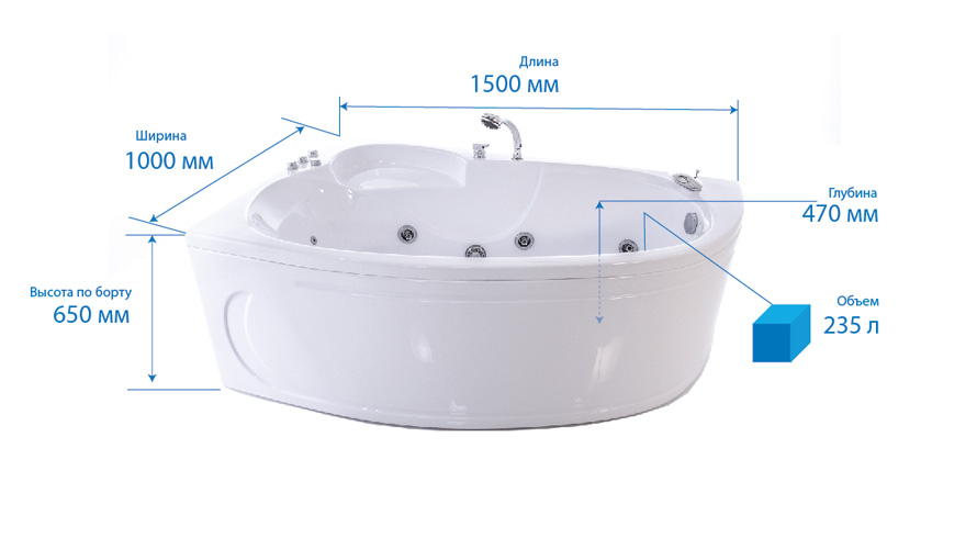 Также есть возможность дополнительных комплектаций гидро- и аэромассажа и дополнительных опций - подсветки и хромотерапии, смеситель на борт ванны, подголовник. Эти возможности (дополнительное оборудование) заказываются опционально за дополнительную стоимость.