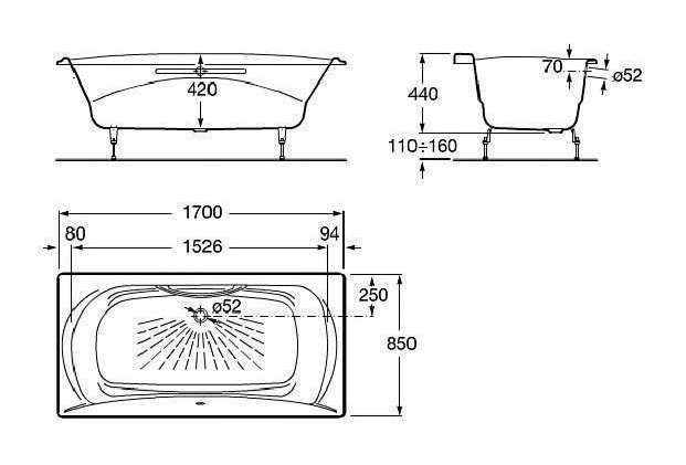Насечки на дне ванной, выполненные в виде расходящихся лучей с антискользящим покрытием не дадут поскользнуться. Сливное отверстие расположено по центру ванной, что делает ее двухсторонней – Вы можете располагаться в ней и слева и справа. Внутренняя стенка ванной имеет семь слоев высокопрочной титановой эмали, а внешняя покрыта грунтовой краской.