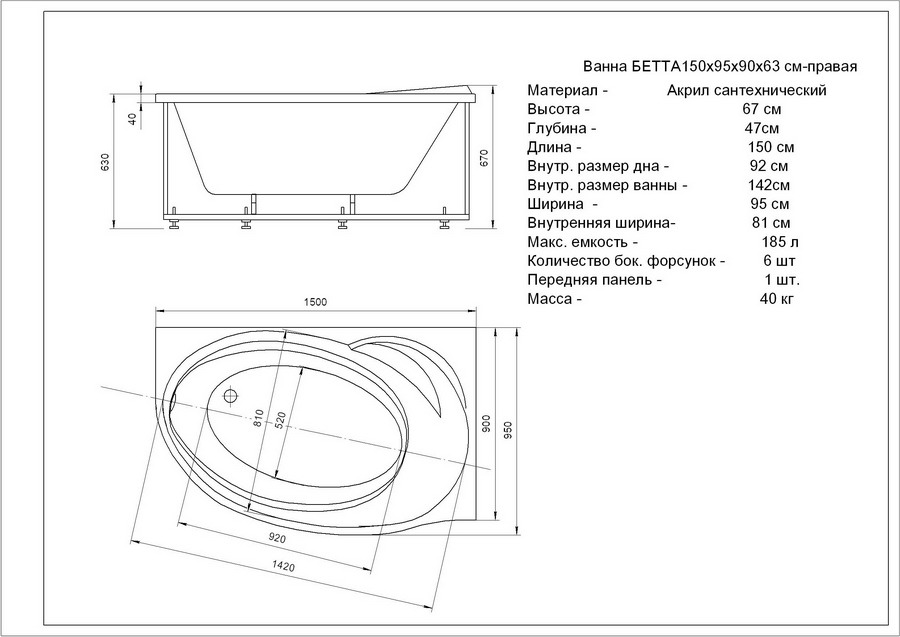 Асимметричная акриловая ванна Акватек Бетта New R 150х95х63 см (Правая) с гидромассажем, на каркасе, со сливом переливом и фронтальным экраном.
