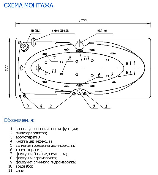 Гидромассаж Стандарт с пневматическим управлением. В комплекте 6 форсунок боковых.