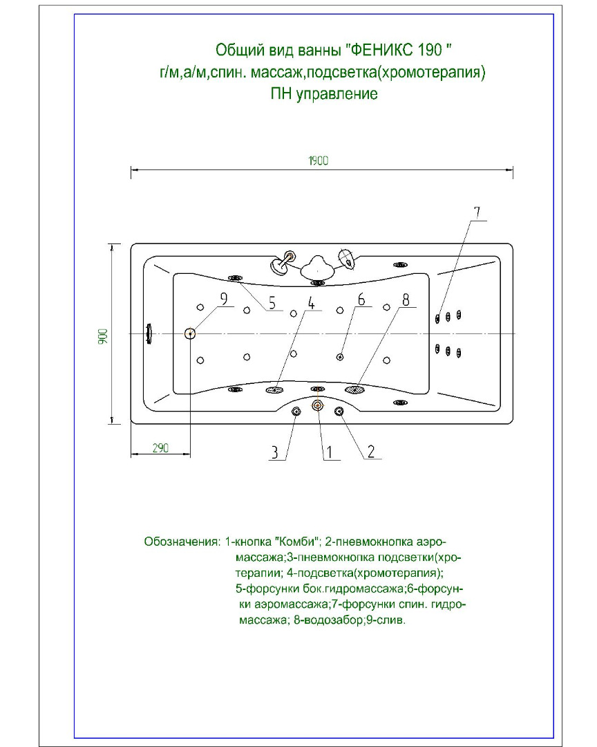 Ванна гидромассажная Акватек Феникс 190х90 НМ (пневматика)