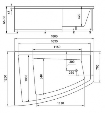 Асимметричная акриловая ванна Акватек Оракул L 180х125х65 см (Левая) с гидромассажем, на каркасе, со сливом переливом и фронтальным экраном.