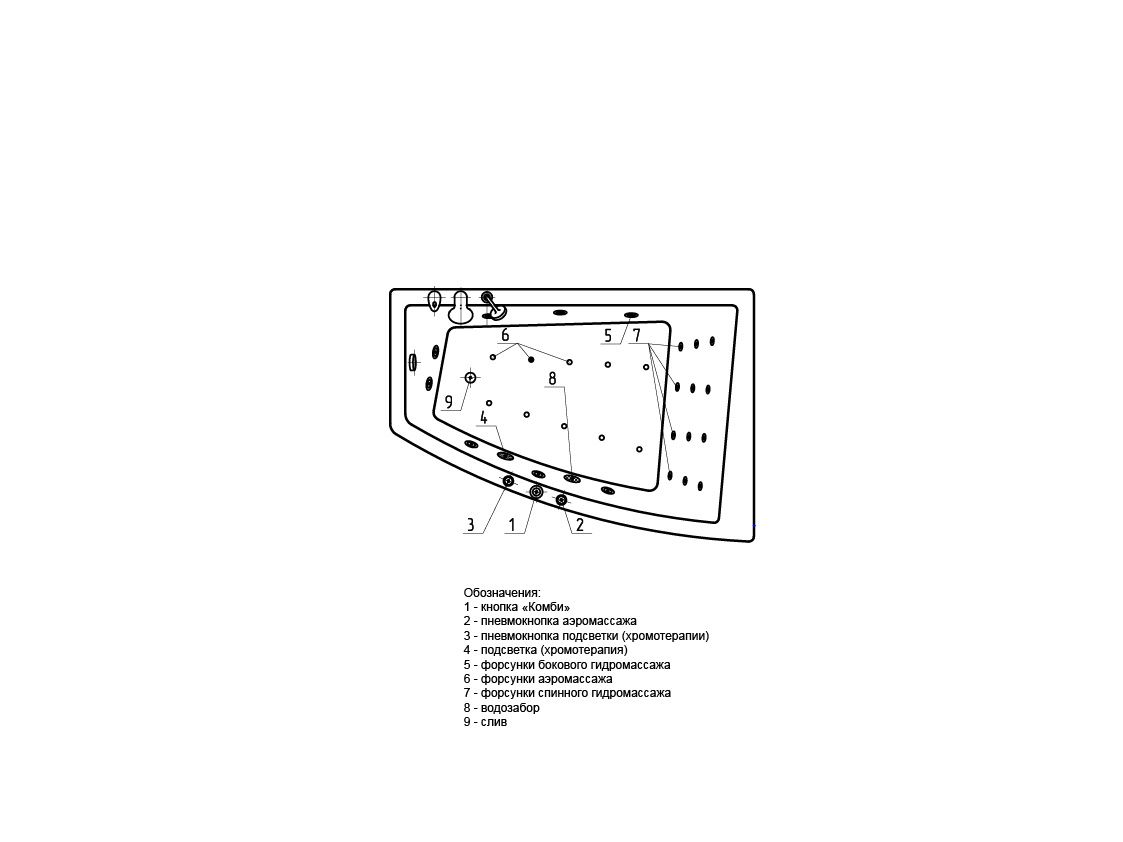 Гидромассаж Стандарт с пневматическим управлением. В комплекте 6 форсунок боковых.
