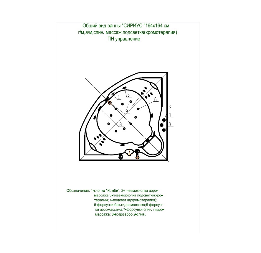 Система гидромассажа ванны Сириус в стандартной комплектации включает 6 форсунок и спинной массаж 6+6 форсунок.