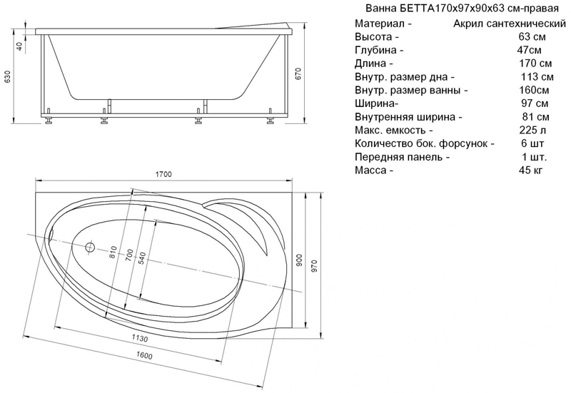 Ванна гидромассажная и аэромассажная Акватек Бетта 170х97 R (пневматика)