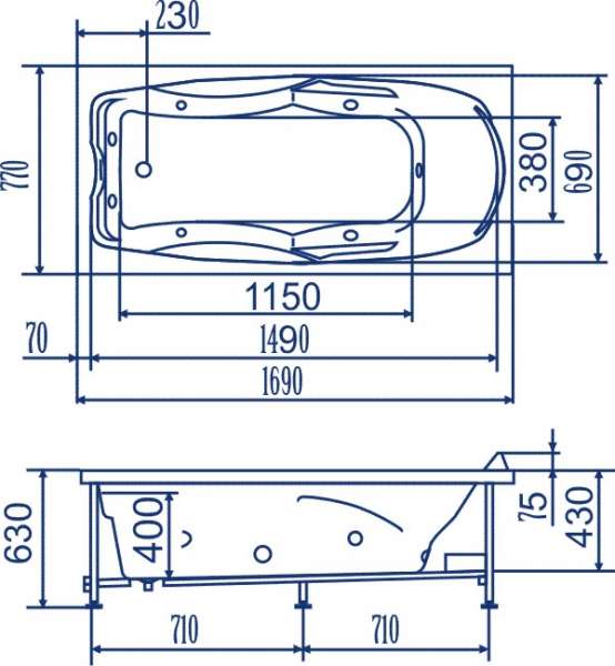 Ванна гидромассажная и аэромассажная Bach Исланд 170х77 система 4А (г/м 6 форсунок, спинной массаж 4 форсунки, аэро массаж 10 форсунок)