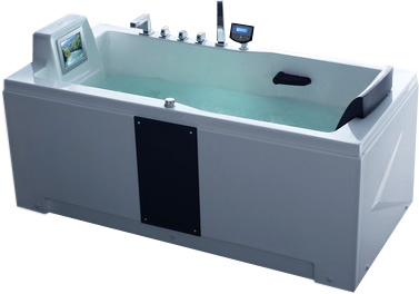 Комплектация ванны: аэромассаж 8 форсунок хром, гидромассаж 9 форсунок хром, защита от сухого пуска, каркас, смеситель с изливом, душевая лейка, съемная панель, массаж спины, мощность насоса, Вт 750, мультимедиа TV 8", пульт ДУ, радио, озонирование, подголовник, регулировка интенсивности массажа, ручки, слив-перелив, тип управления электронное, хромотерапия