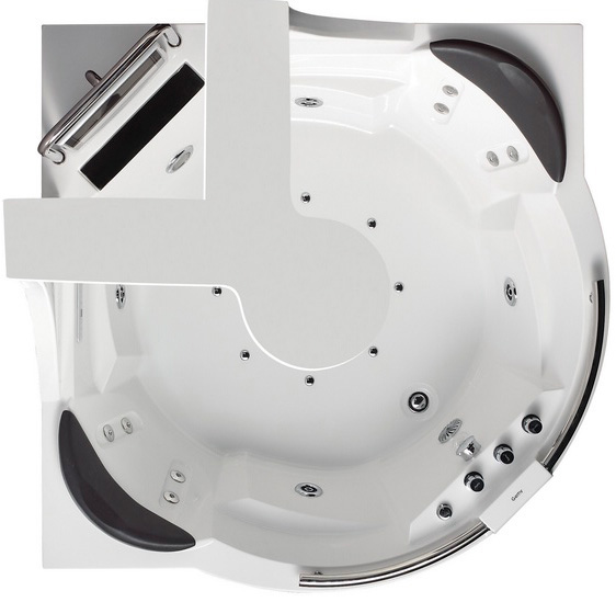 Комплектация ванны: аэромассаж 8 форсунок хром, гидромассаж 12 форсунок хром, защита от сухого пуска, каркас, смеситель с изливом, тропический душ, душевая лейка, съемная панель, массаж спины, мощность насоса, Вт 1500, мультимедиа TV 15", пульт ДУ, CD/DVD, радио, озонирование, подголовник, регулировка интенсивности массажа, слив-перелив, хромотерапия