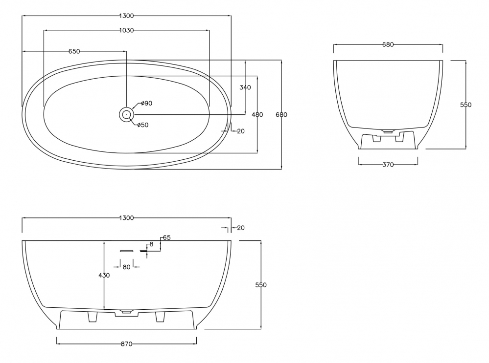 Ванна из искусственного камня Abber Stein 130x68 белая матовая (AS9641-1.3)