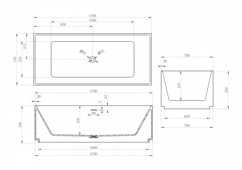 Ванна из искусственного камня Abber Stein 170x75 белая матовая (AS9602)