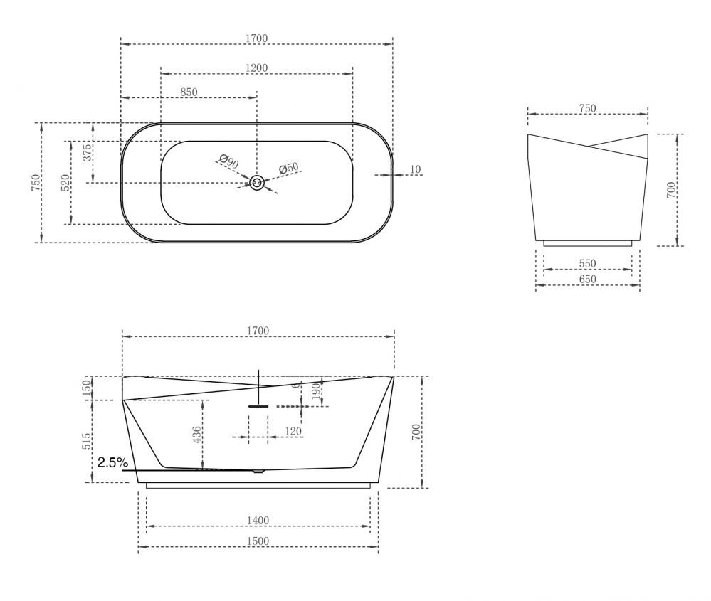 Ванна из искусственного камня Abber Stein 170x75 белая матовая (AS9609)