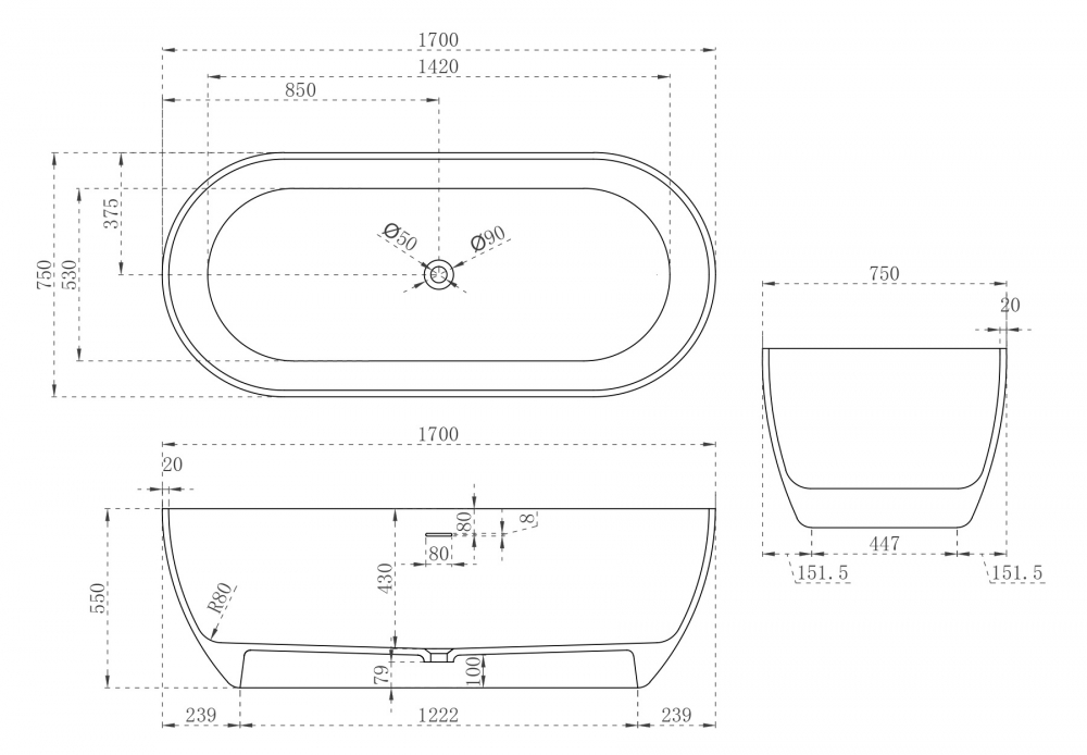 Ванна из искусственного камня Abber Stein 170x75 белая матовая (AS9613-1.7)