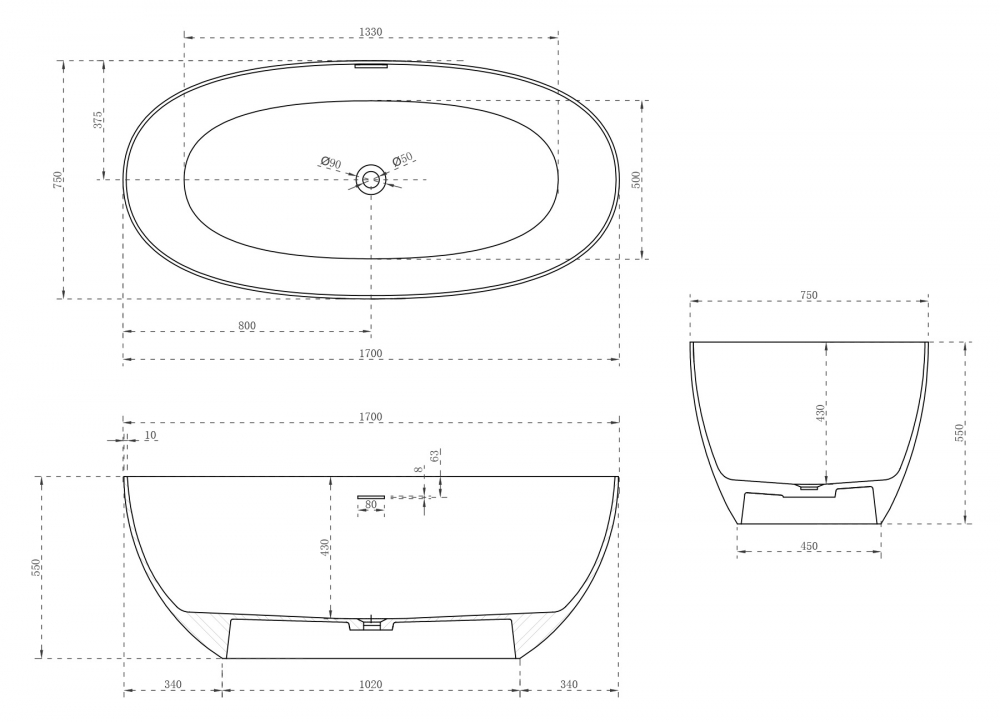 Ванна из искусственного камня Abber Stein 170x75 белая матовая (AS9624-1.7)