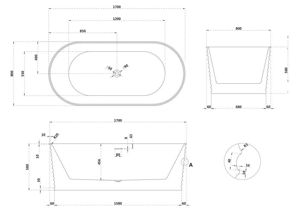 Ванна из искусственного камня Abber Stein 170x80 белая матовая (AS9650)