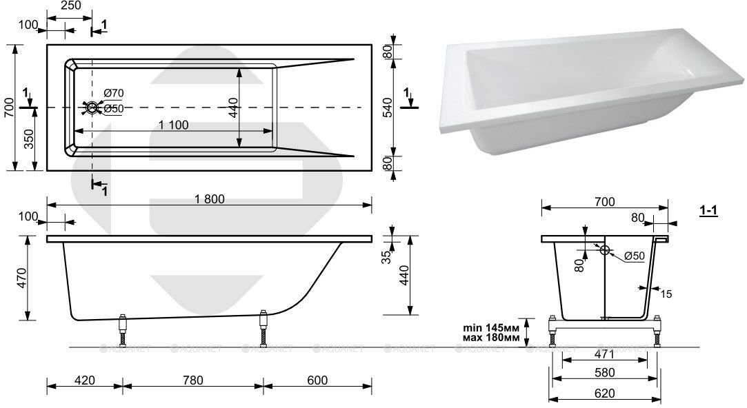 Состав поставки: ванна. Каркас/ножки/экран - приобретаются отдельно.