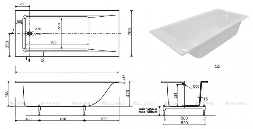 Состав поставки: ванна. Каркас/ножки/экран - приобретаются отдельно.