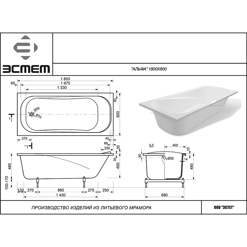 Ванна из литьевого мрамора Эстет Альфа 180х80