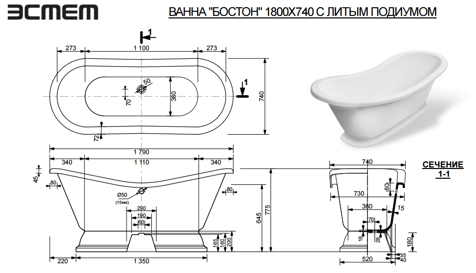 Ванна из литьевого мрамора Эстет Бостон 180х74 на подиуме