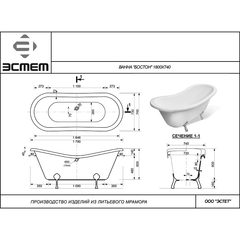 Ванна из литьевого мрамора Эстет Бостон 180х74