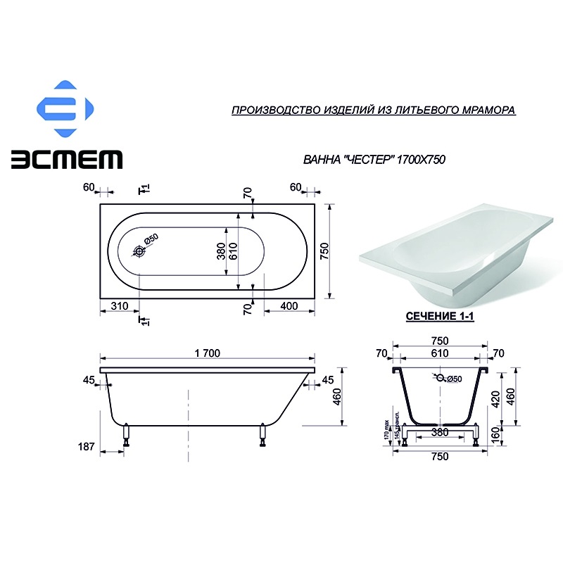 Ванна из литьевого мрамора Эстет Честер 170х75