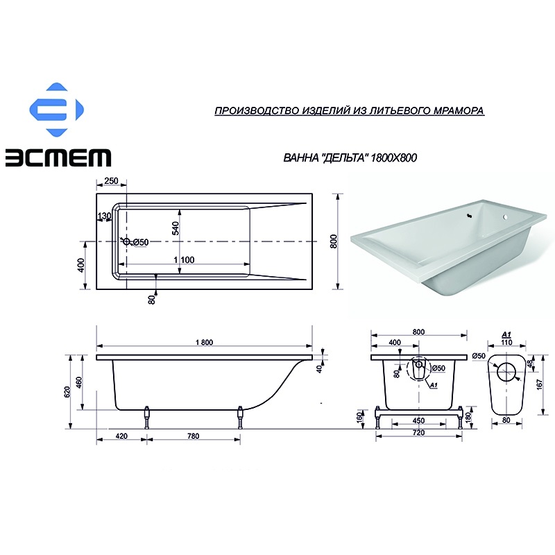 Ванна из литьевого мрамора Эстет Дельта 180х80