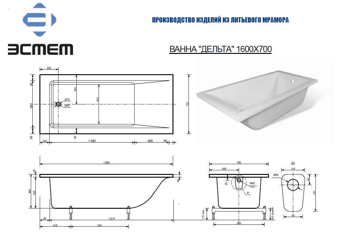 Ванна из литьевого мрамора Эстет Дельта А 160х70