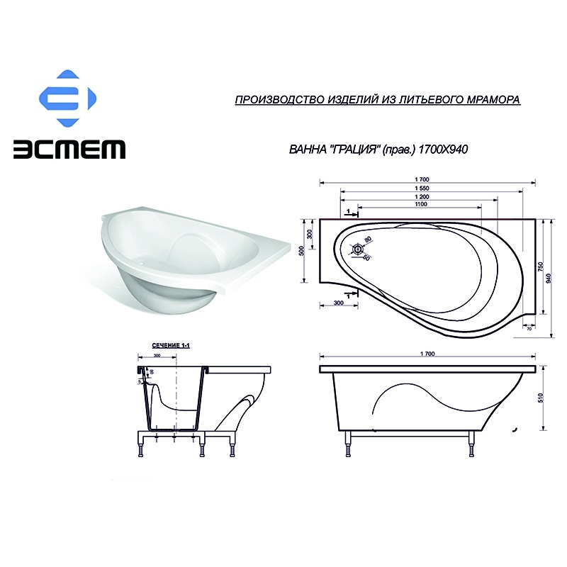 Дополнительная комплектация: Экран фронтальный для ванны Эстет Грация 1700х650 R, Экран торцевой для ванны Грация 500х650 R, Экран торцевой для ванны 750 Грация 750х650 R, Подставка с регулируемыми опорами Грация 1700х940х510 R приобретаются отдельно.