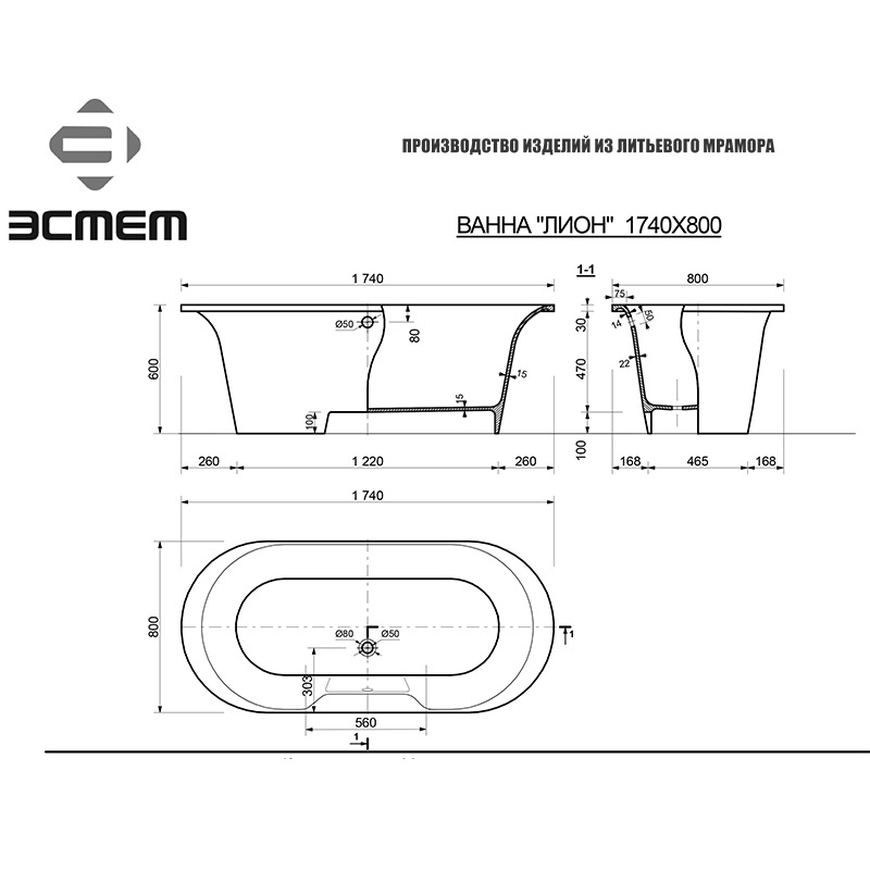 Ванна из литьевого мрамора Эстет Лион 174х80