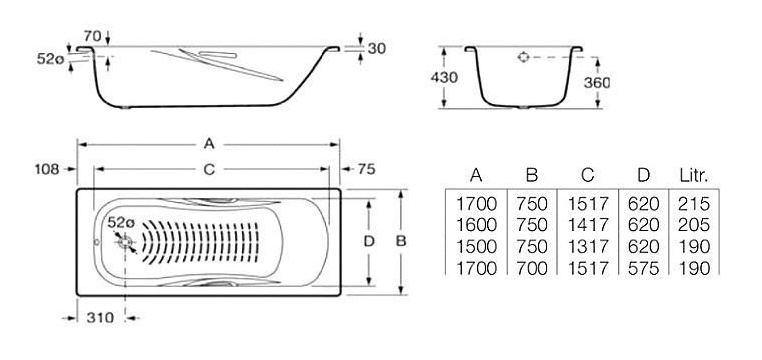 Прямоугольная стальная ванна Рока Princess 170х75 см с отверстием под ручки. Ножки и ручки для этой ванны приобретаются отдельно.