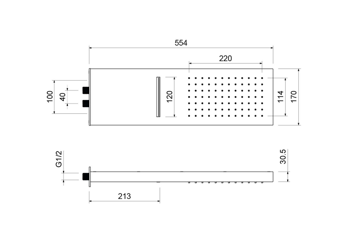 долговечная конструкция из нерж., конструкция для монтажа на стену, соединение - наружн. резьба 1/2", 2 реж. струи: rain + waterfall, монтируется без кроншейна, легкая установка на стену, размер: 550x170х30 мм