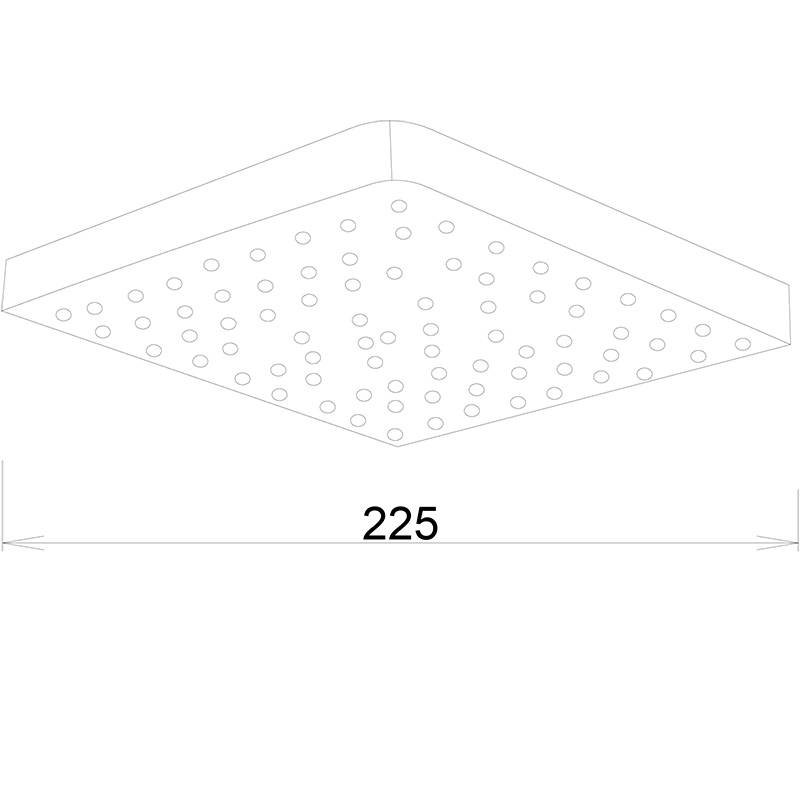Лейка верхнего душа квадратная сделана из легкого и прочного ABS пластика, имеет зеркальное хромированное покрытие, размер 225х225мм