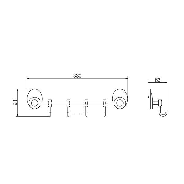 вешалка из 4 подвижных крючков на горизонтальной планке настенного монтажа, L=330 мм