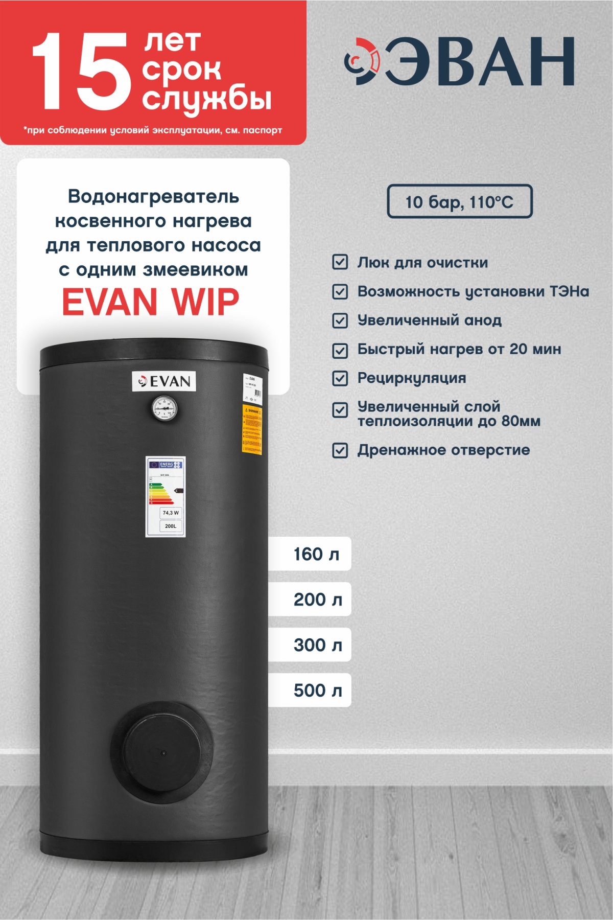 Эмалированный бойлер косвенного нагрева для тепловых насосов с одним змеевиком EVAN WIP предназначен для организации горячего водоснабжения с геотермальными и воздушными тепловыми насосами. Увеличенная площадь теплообмена змеевика и его дублирование дает низкое гидравлическое сопротивление и обеспечивает быстрый нагрев воды с высокой мощностью, а также исключает возникновение ошибок и ограничений. Также бак имеет возможность встраивания дополнительного ТЭНа и ревизионный люк.