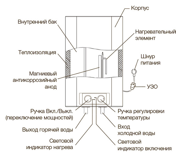 Комплектация: Водонагреватель, предохранительный клапан, термометр, антикоррозийный анод, световой индикатор, индикатор нагрева
