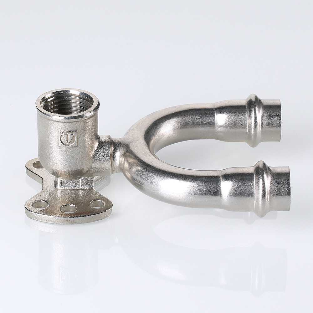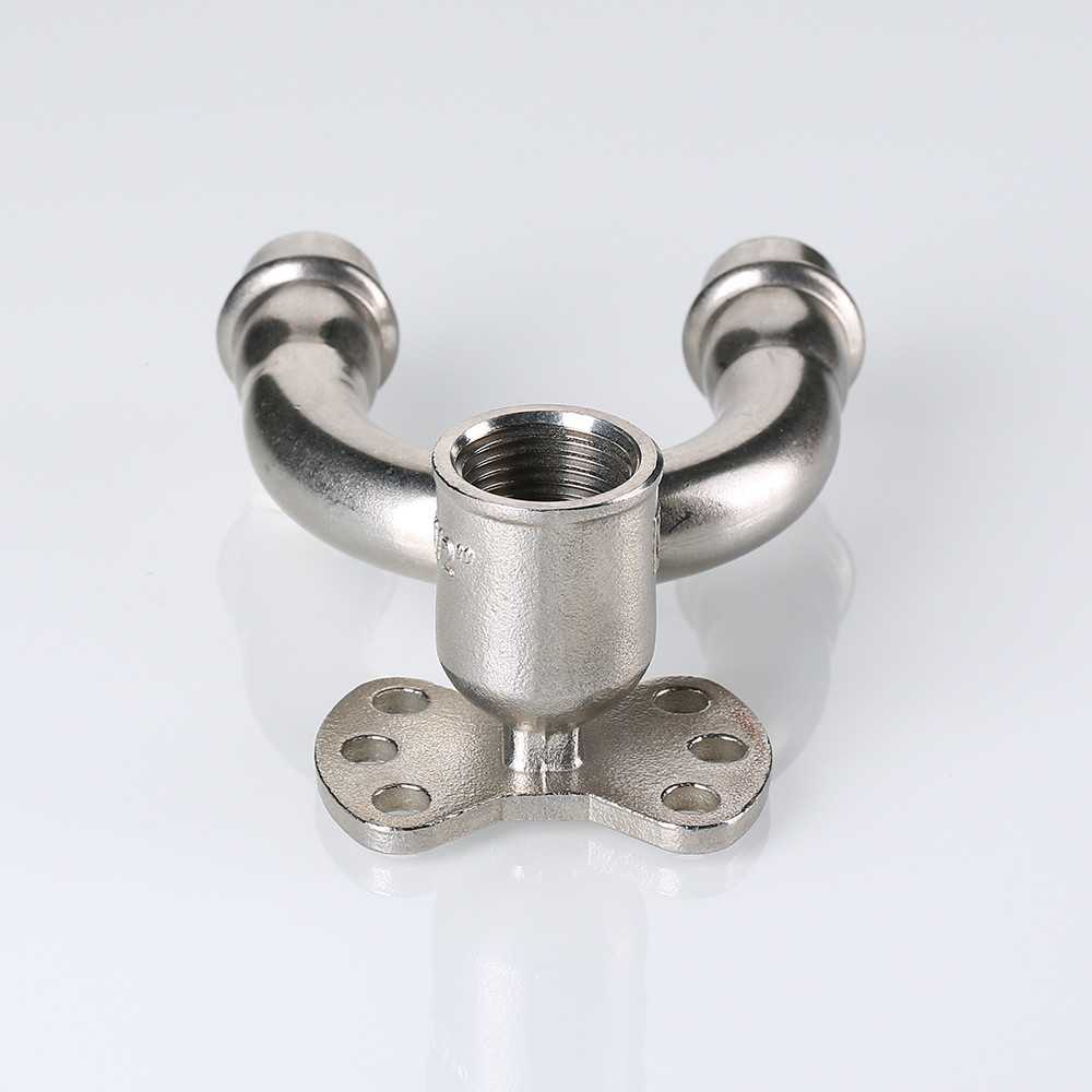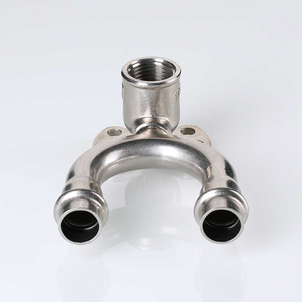 Проходная водорозетка в системе INOX-PRESS представляет собой U-образный тройник с угловым переходом на внутреннюю резьбу в центральном отводе и креплением.