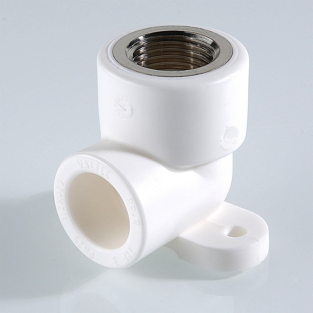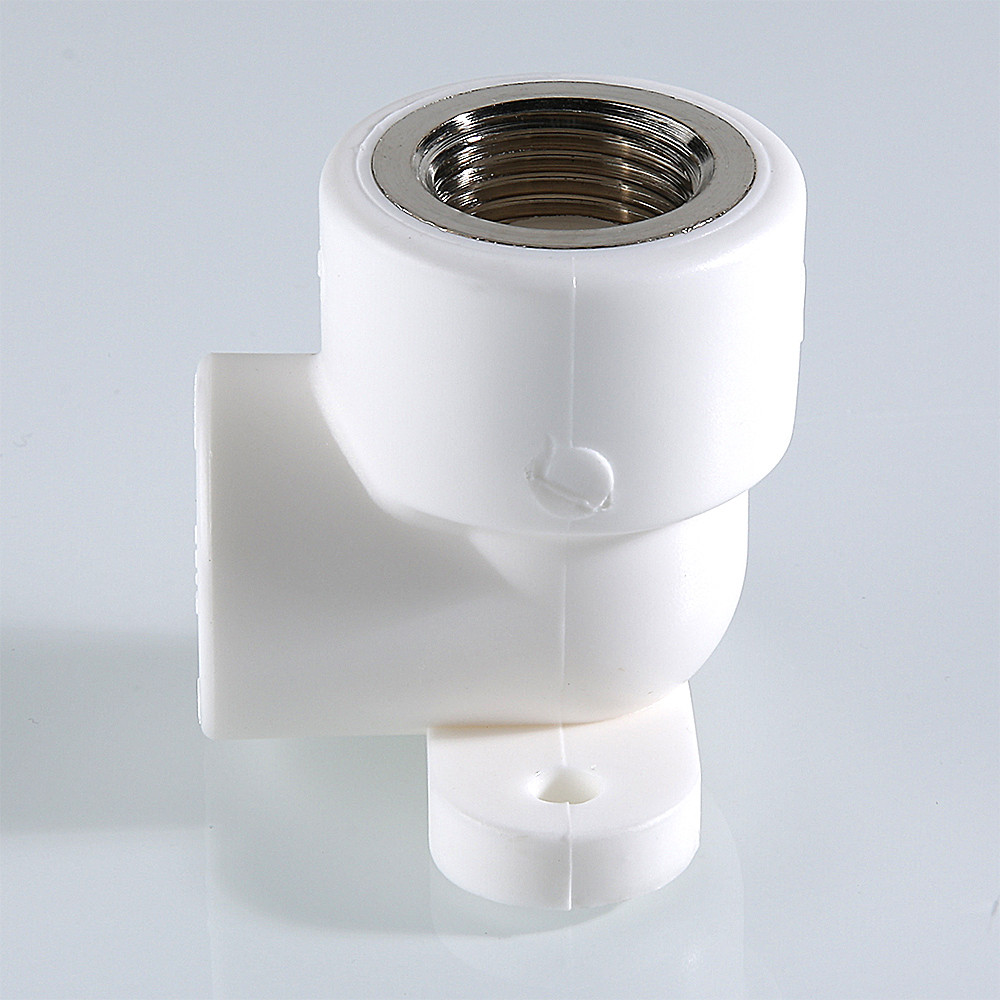 Комбинированный угловой фитинг с креплением (полипропиленовая водорозетка), предназначенный для подсоединения к полипропиленовому трубопроводу сантехнического смесителя или другого компонента инженерной системы с резьбовым подключением. Резьба фитинга – внутренняя трубная по ГОСТу 6357.