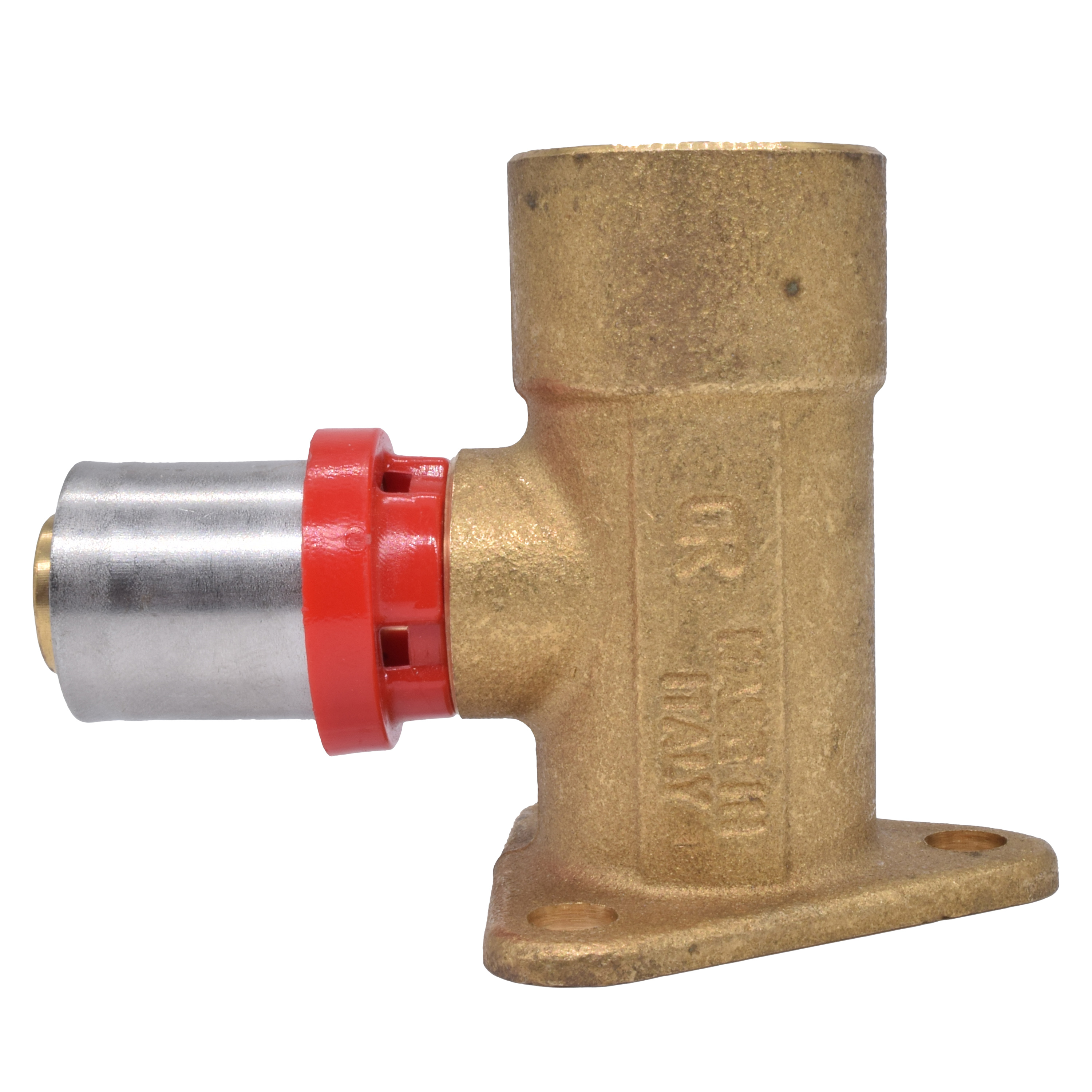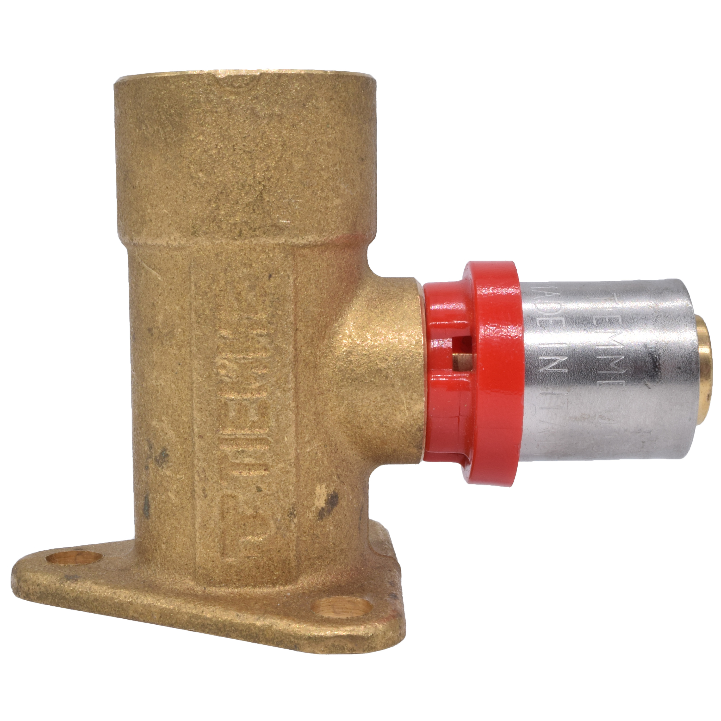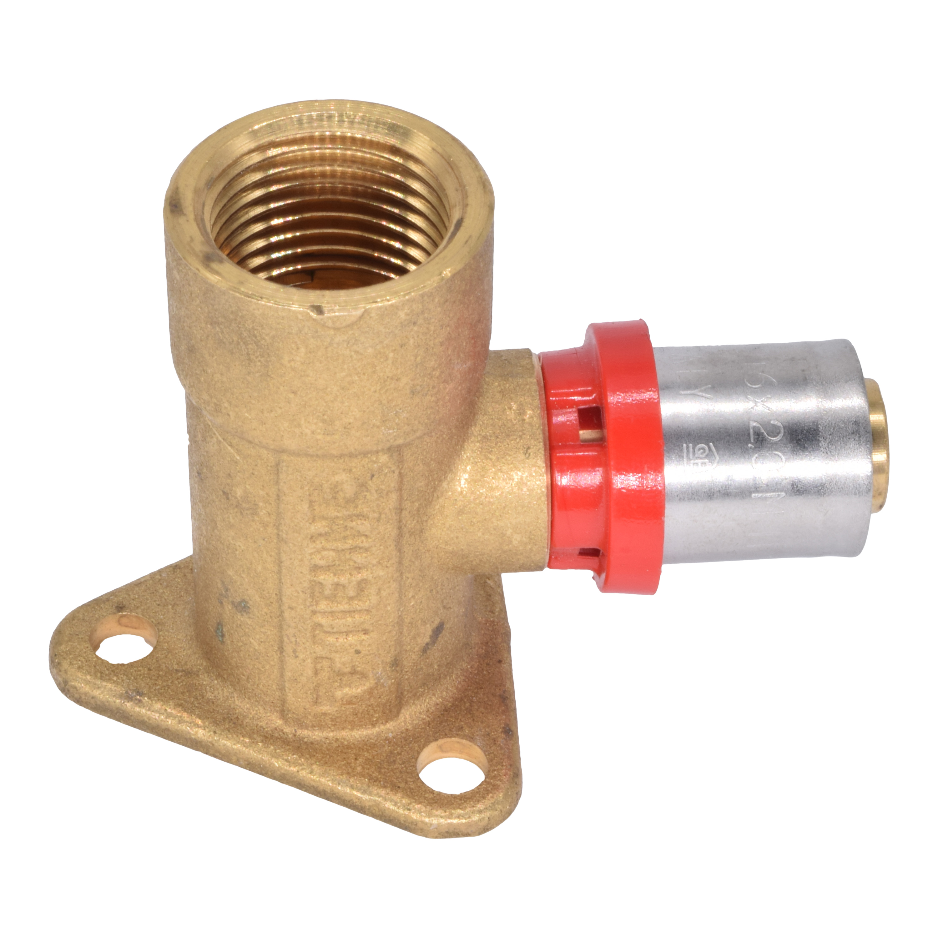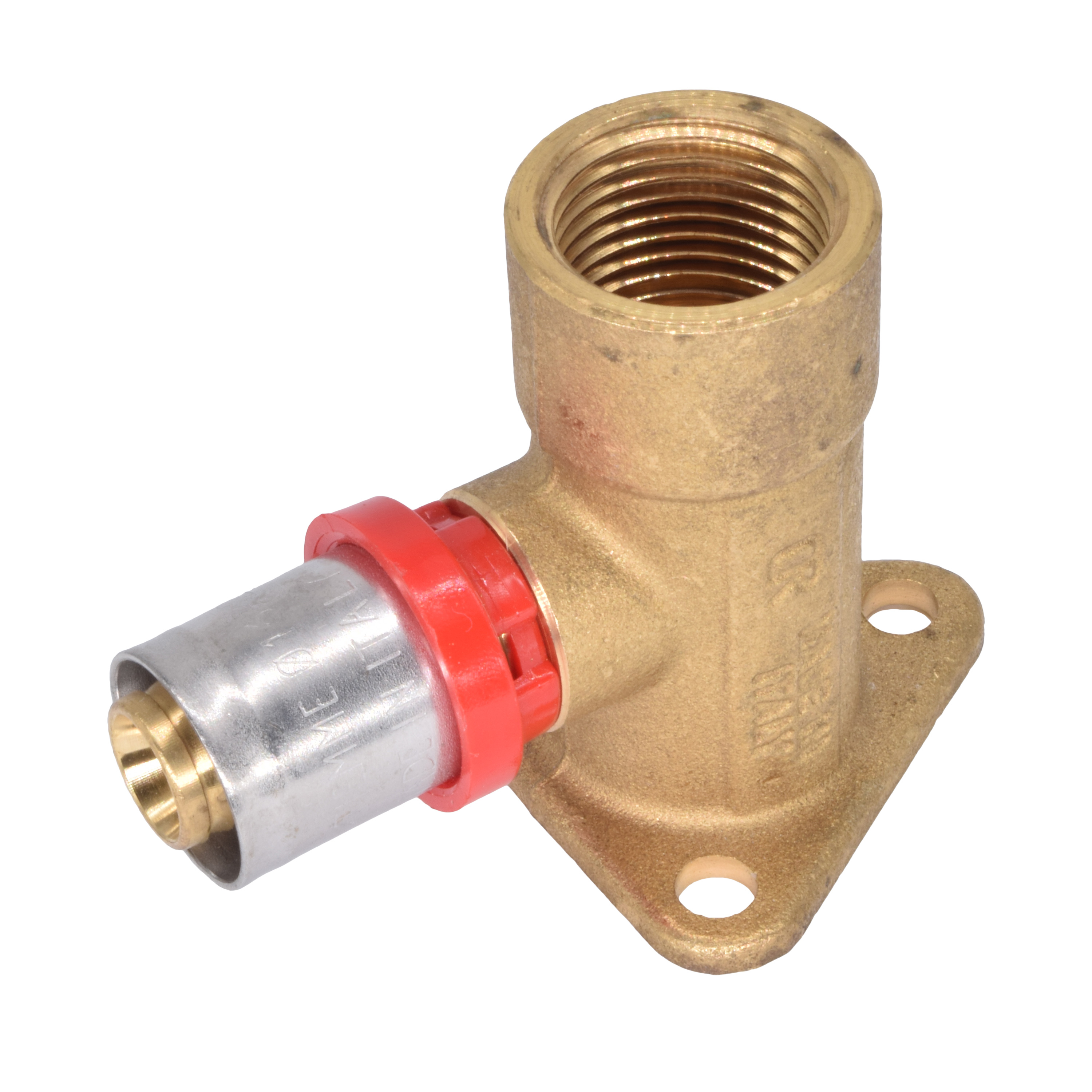 Водорозетка Tiemme 16*1/2" латунь (пресс, отступ 22,5 мм.) (1651021 / 1656CE) / Угольник с внутренней резьбой, с фланцем с 3 отверстиями и высотой шейки 52 мм (Art. 1656CE)