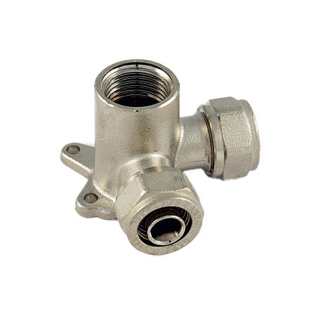 Используется для установки на магистралях, подводящих холодную или горячую воду, а также в отопительных системах. Позволяет подключить два водоразборных прибора одновременно. Представляет угловой тройник с креплением (проходная водорозетка) для соединения металлопластиковой трубы с компонентом системы, имеющим резьбовое подключение. Резьба фитинга – внутренняя (трубная)