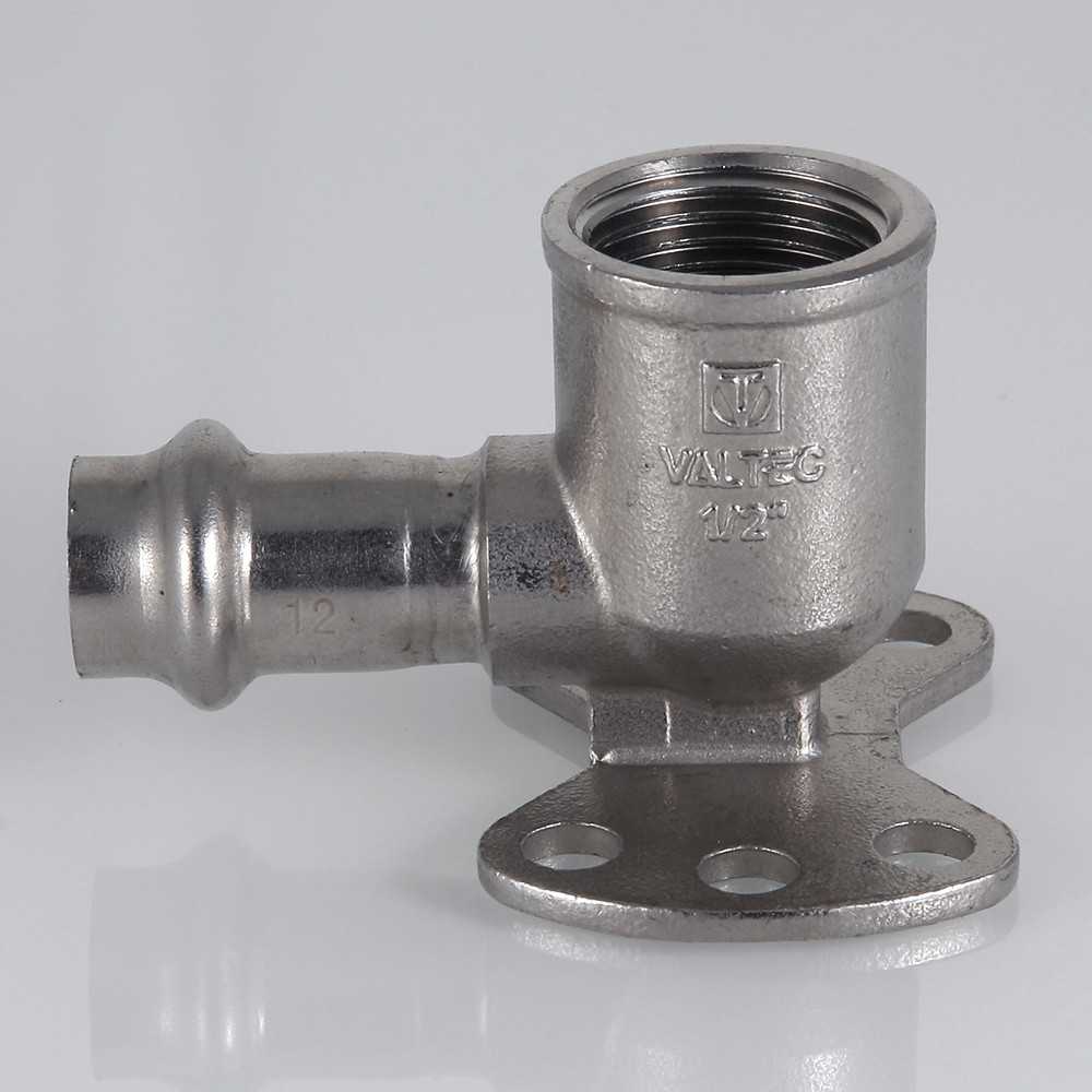 Пресс-угольник из нержавеющей стали с переходом на внутреннюю резьбу и креплением (водорозетка) обеспечивает соединение тонкостенной стальной трубы с резьбовым элементом (в частности, патрубком сантехнического смесителя) монтируемой системы под углом 90°. Область применения пресс-водорозетки из нержавеющей стали – трубопроводы водоснабжения, отопления, иные инженерные и технологические установки с рабочей температурой до 120 °С и давлением до 16 бар.